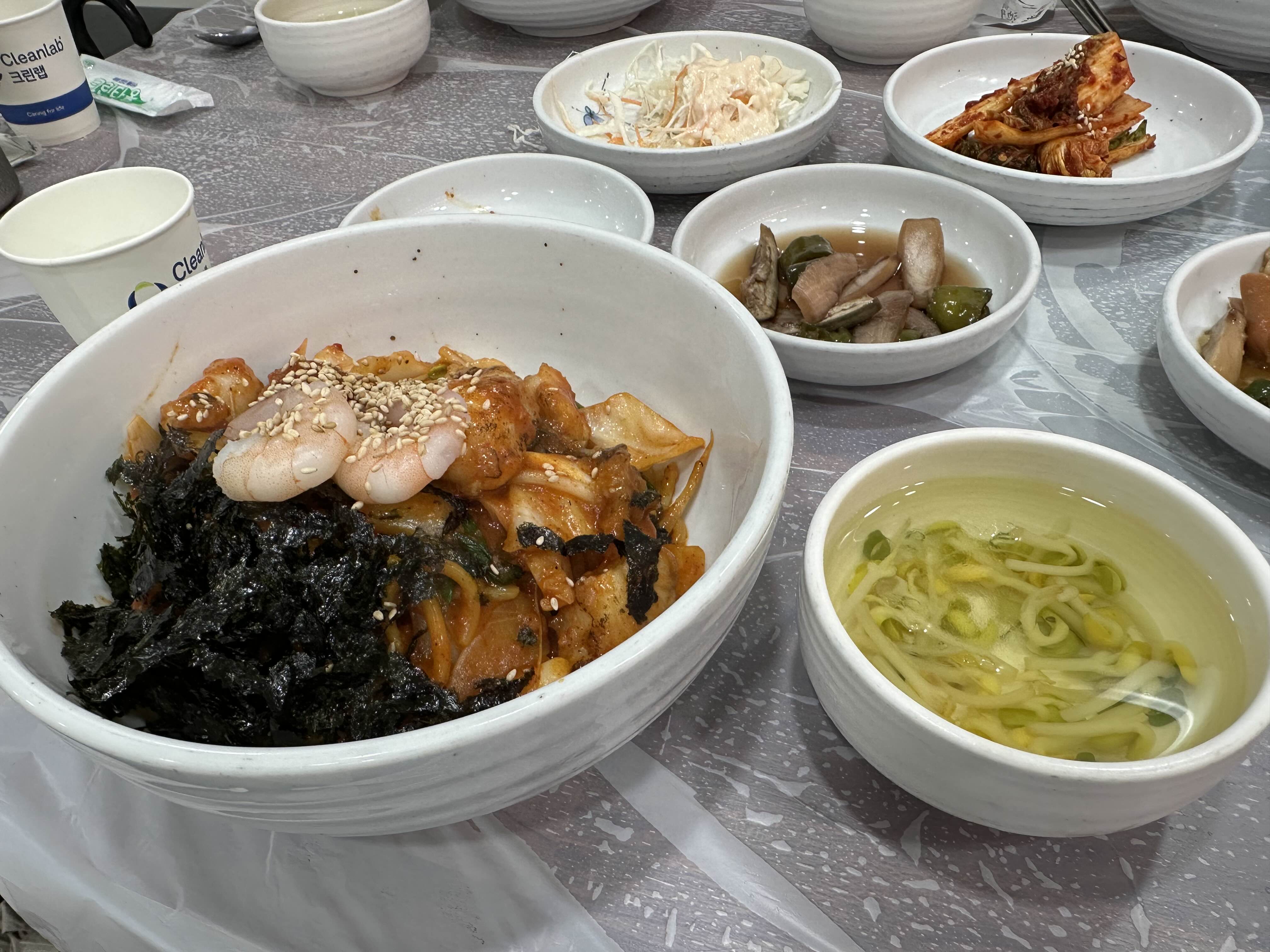 코다리포?무침, 양배추샐러드, 당근양파고추지, 배추겉절이, 버섯조림, 노각무침, 콩나물냉국