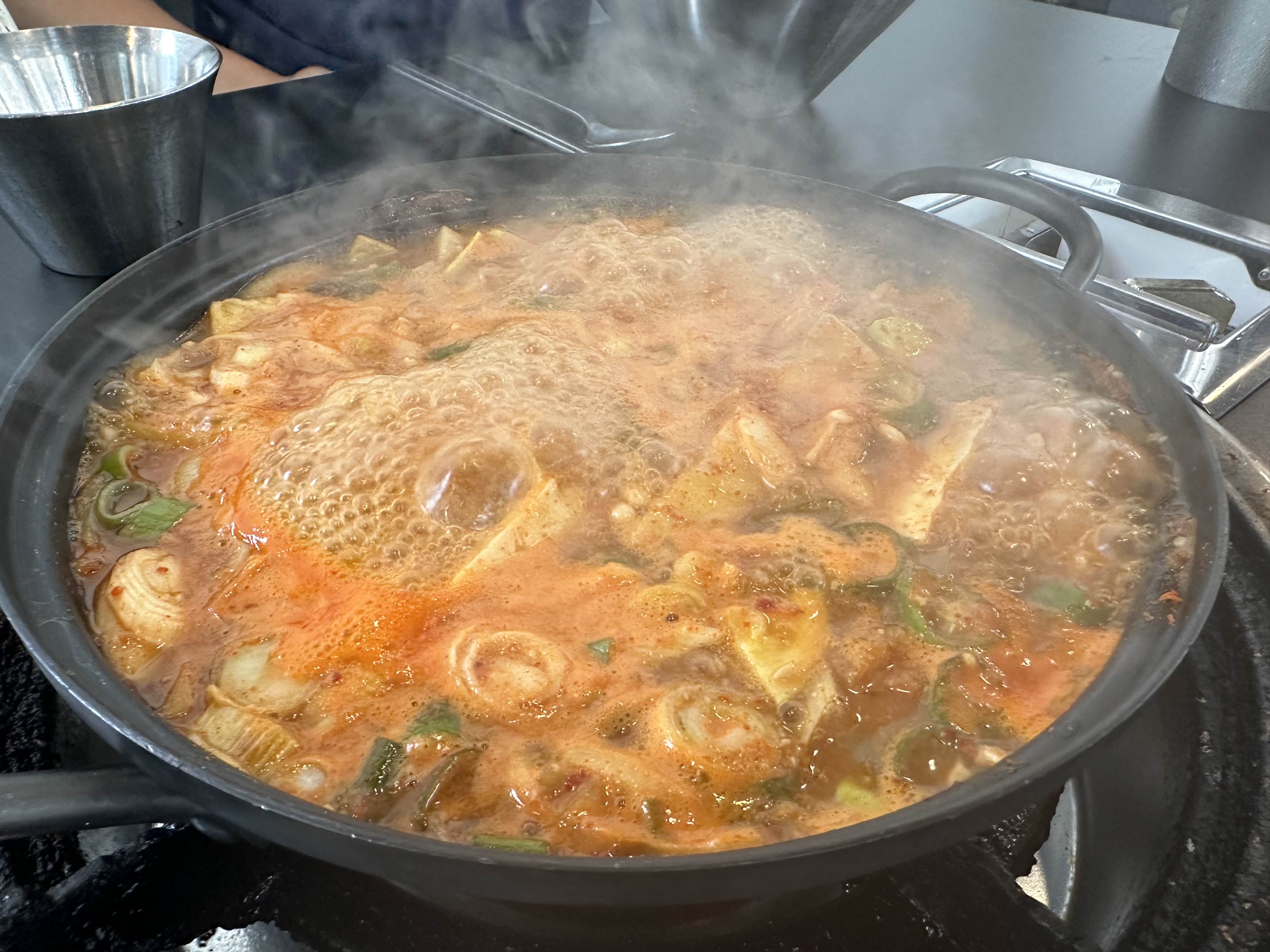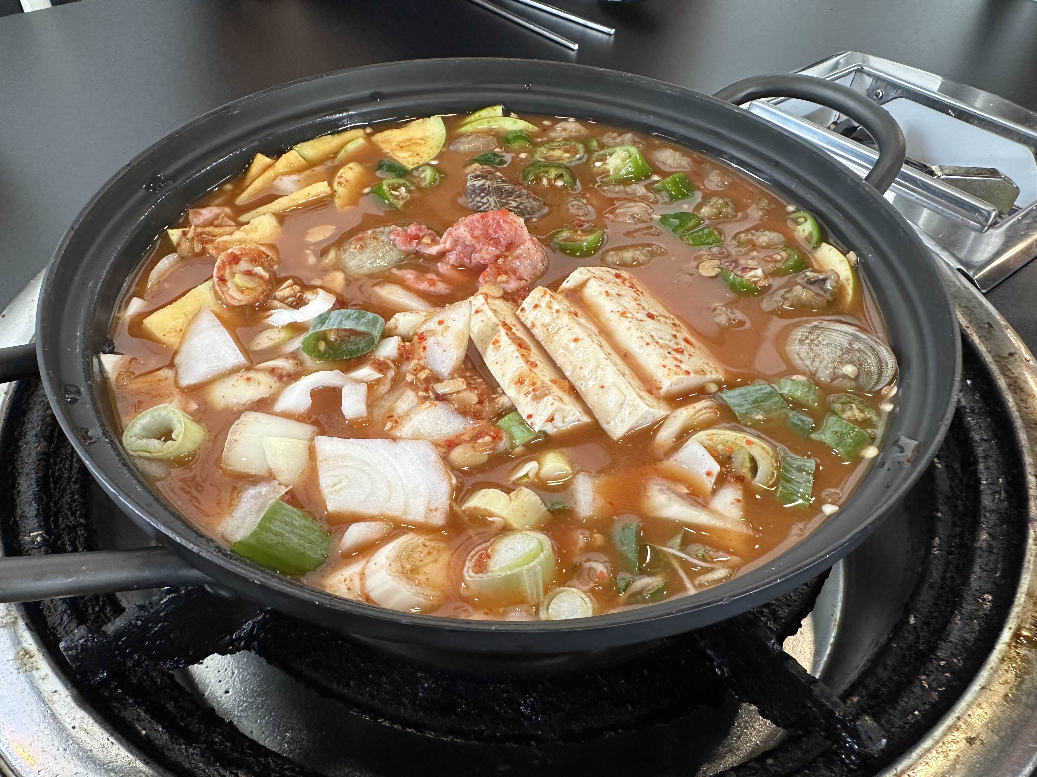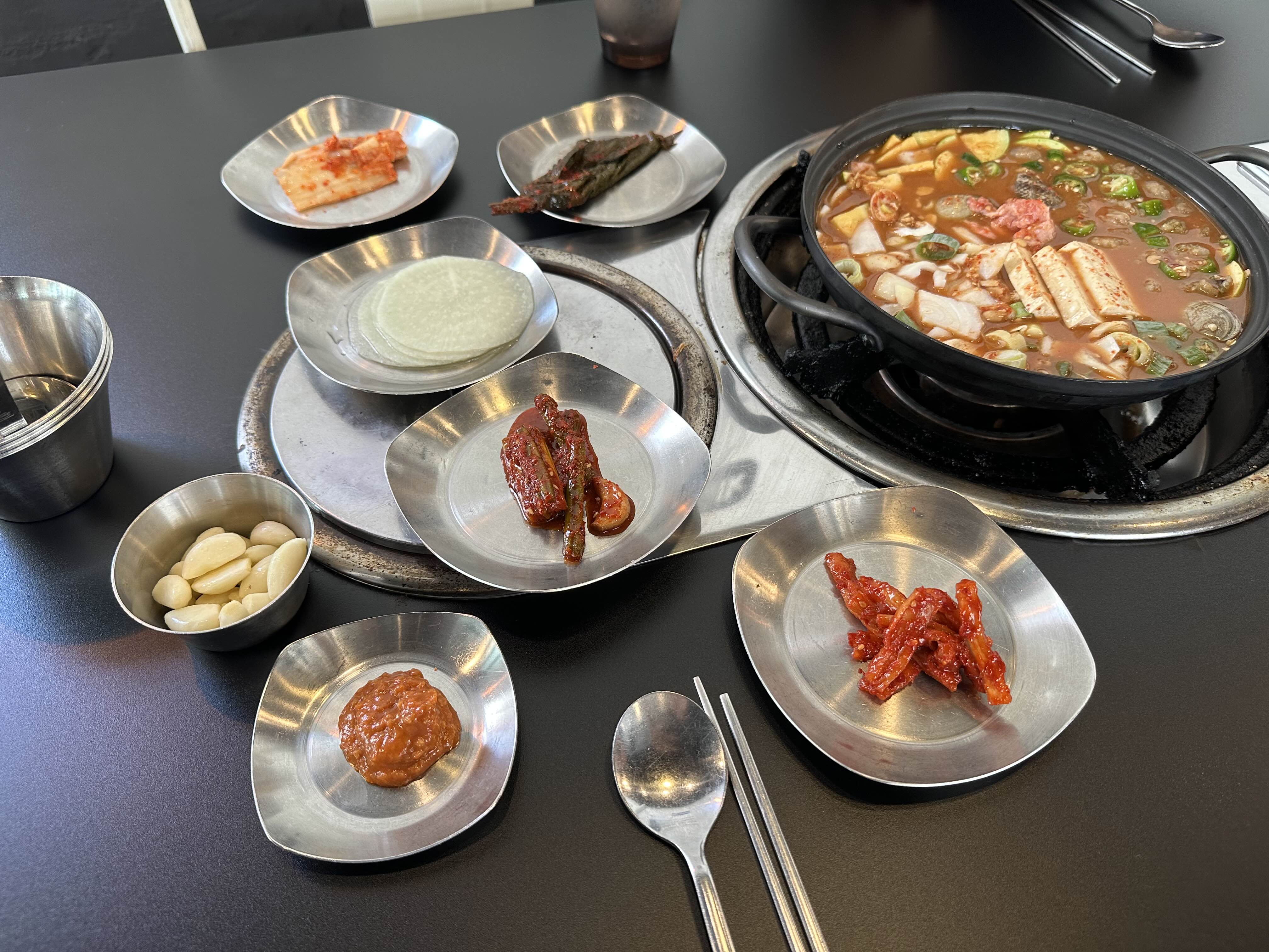 차돌박이가 들어간 된장찌개는 뜨끈한 국물이 진하게 우러나왔다.