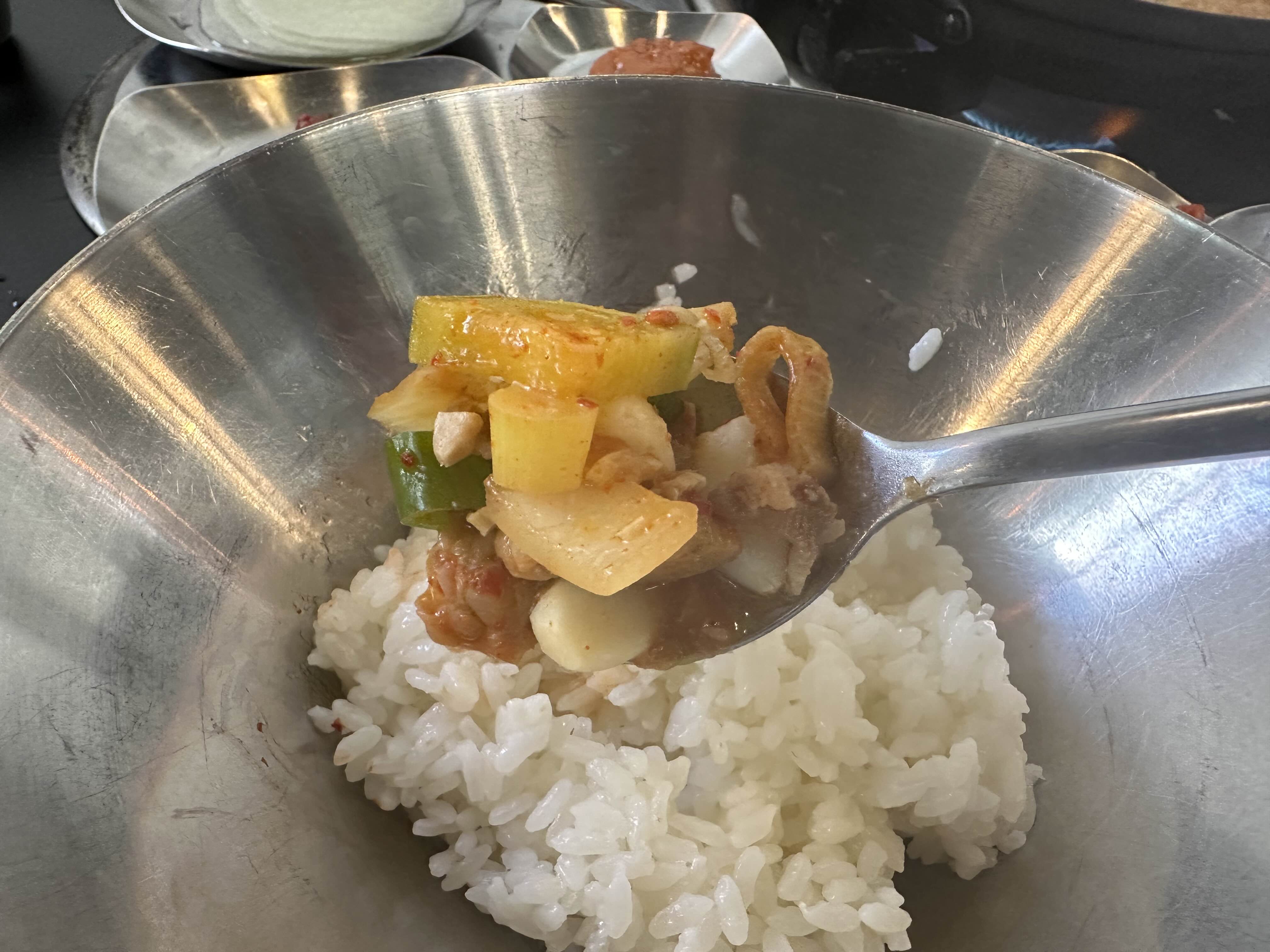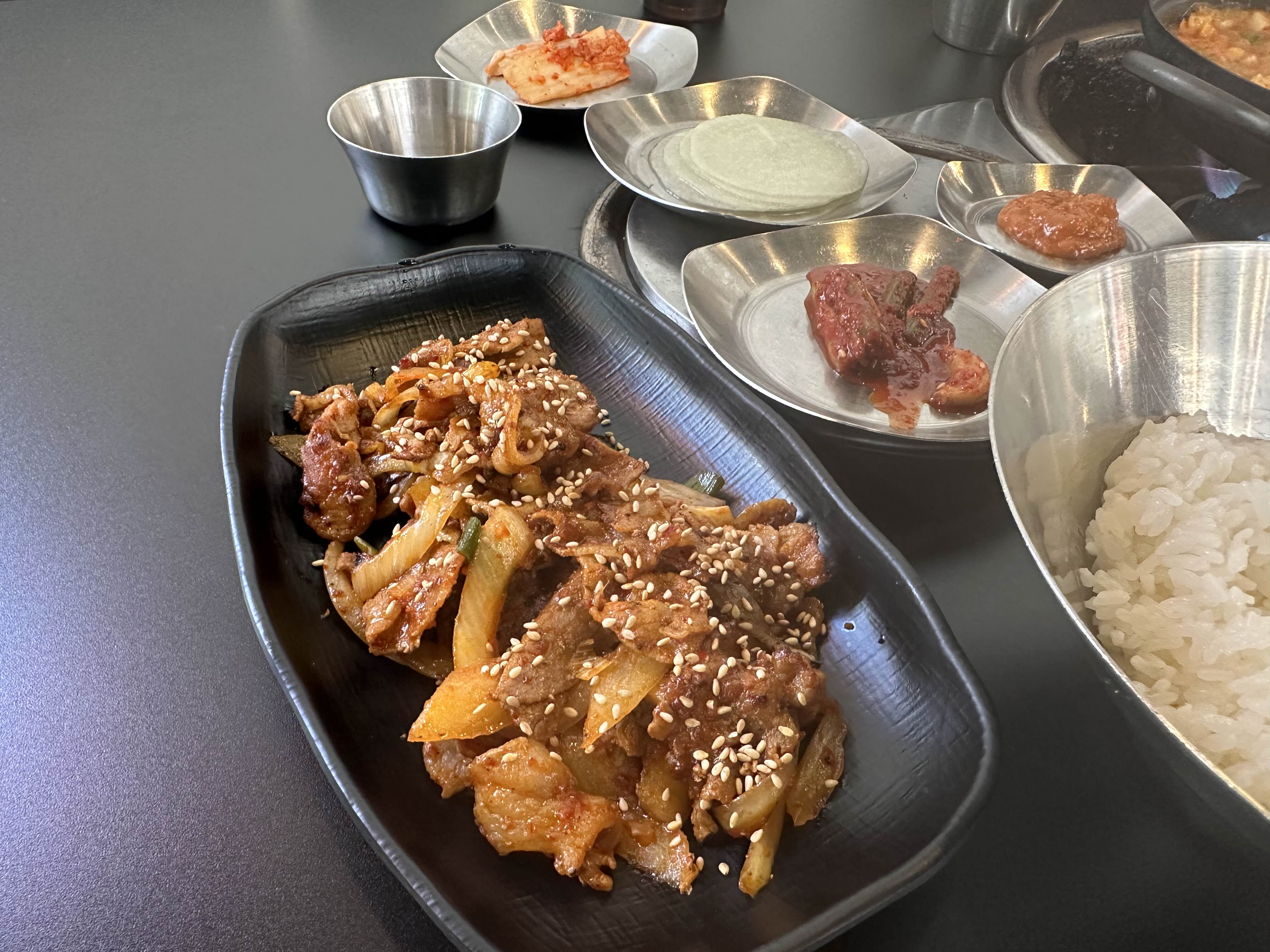 조금 후, 비벼먹을 수 있는 큰 그릇의 밥과 제육볶음이 나왔다. 달콤하고 매콤한 제육볶음은 된장찌개와 함께 먹으니 더욱 맛있었다. 따뜻한 밥에 된장찌개 한 숟가락, 그리고 제육볶음 한 점을 얹어 먹으니 만족스러운 식사였다.