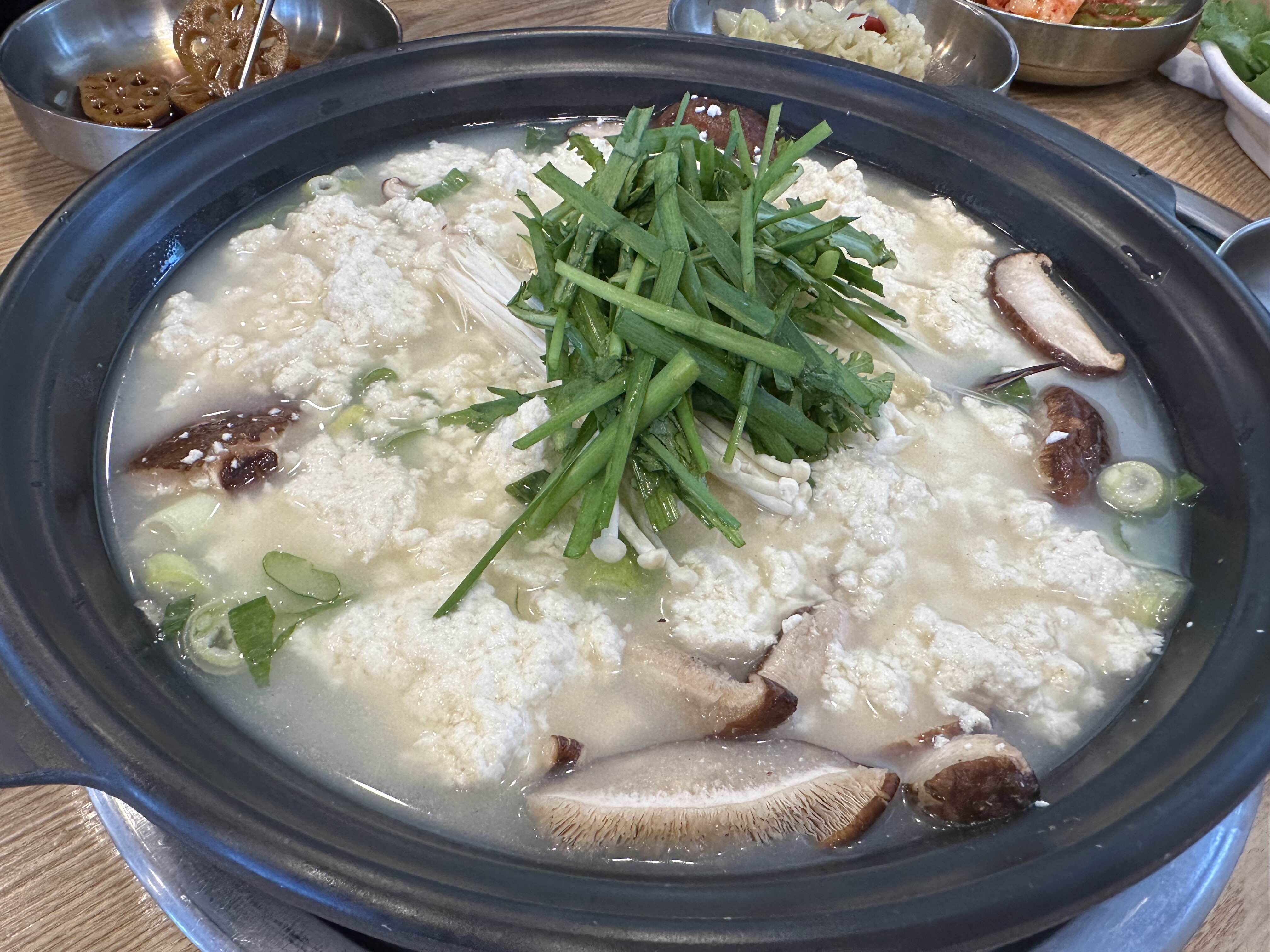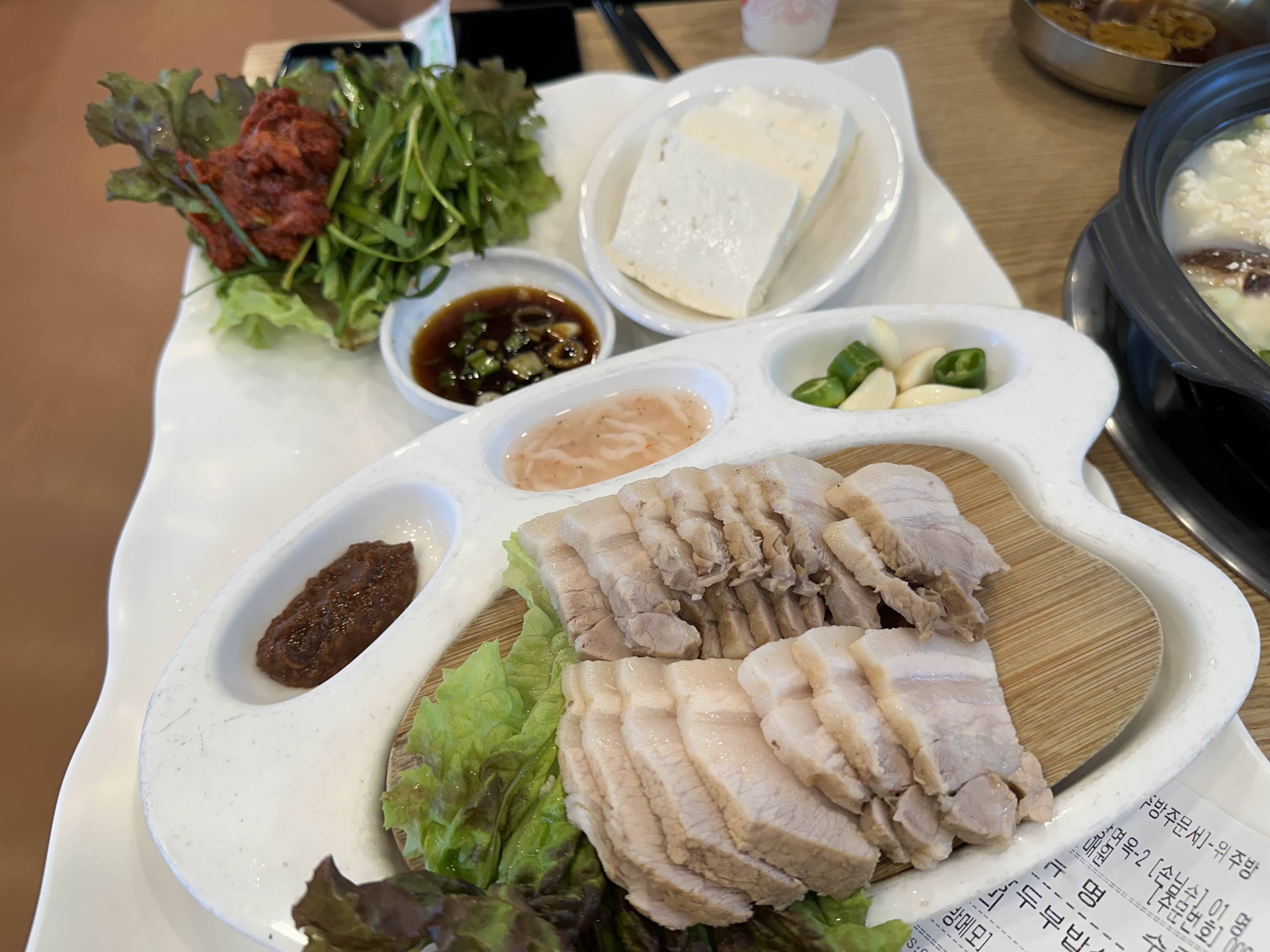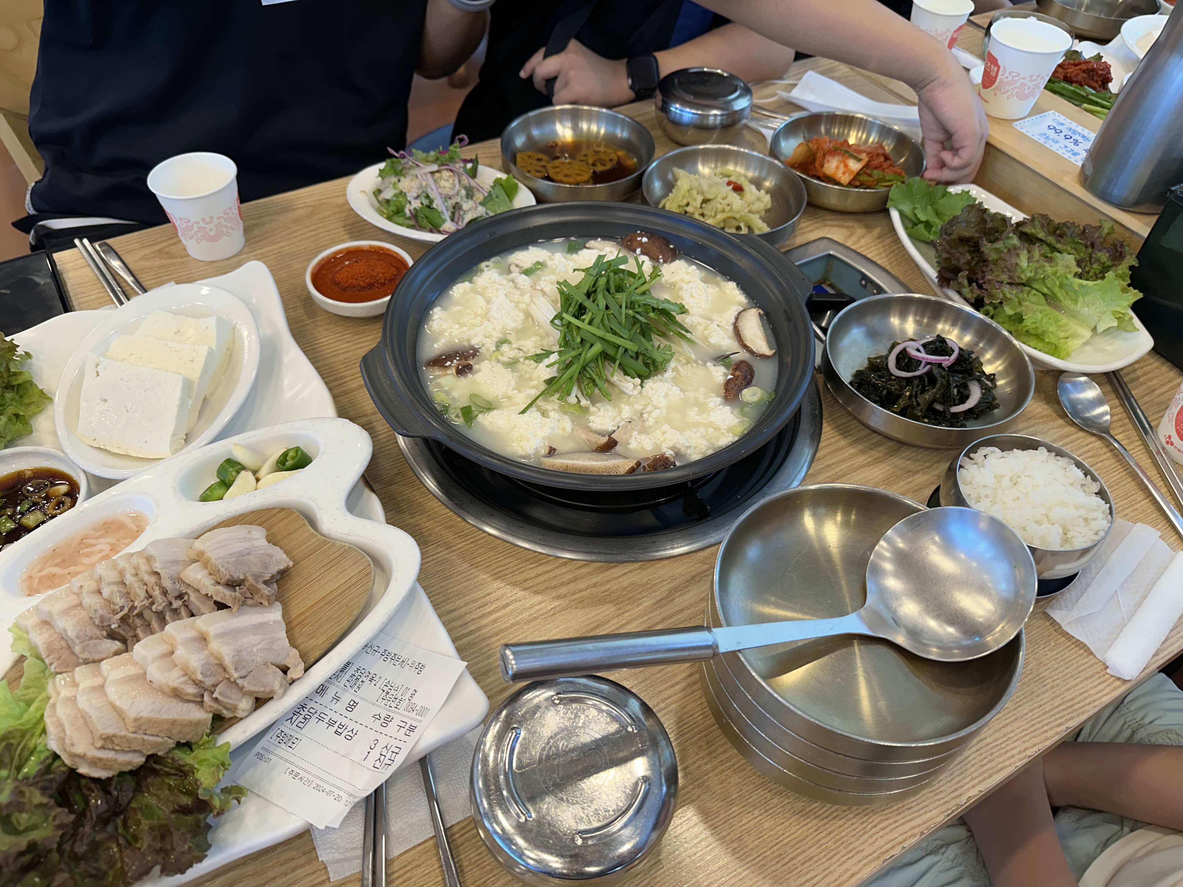 우리는 초당두부밥상을 주문했다. 아이들이 함께 있었기 때문에 고추가루는 별도로 담아달라고 요청했다. 곧이어 몽글몽글한 순두부전골과 두부삼합이 나왔다. 모든 음식이 정갈하게 잘 차려져 있었고, 맛도 정말 좋았다. 가족 모두가 만족스러운 식사를 즐길 수 있었고, 강원도 여행의 시작이 아주 행복했다.
