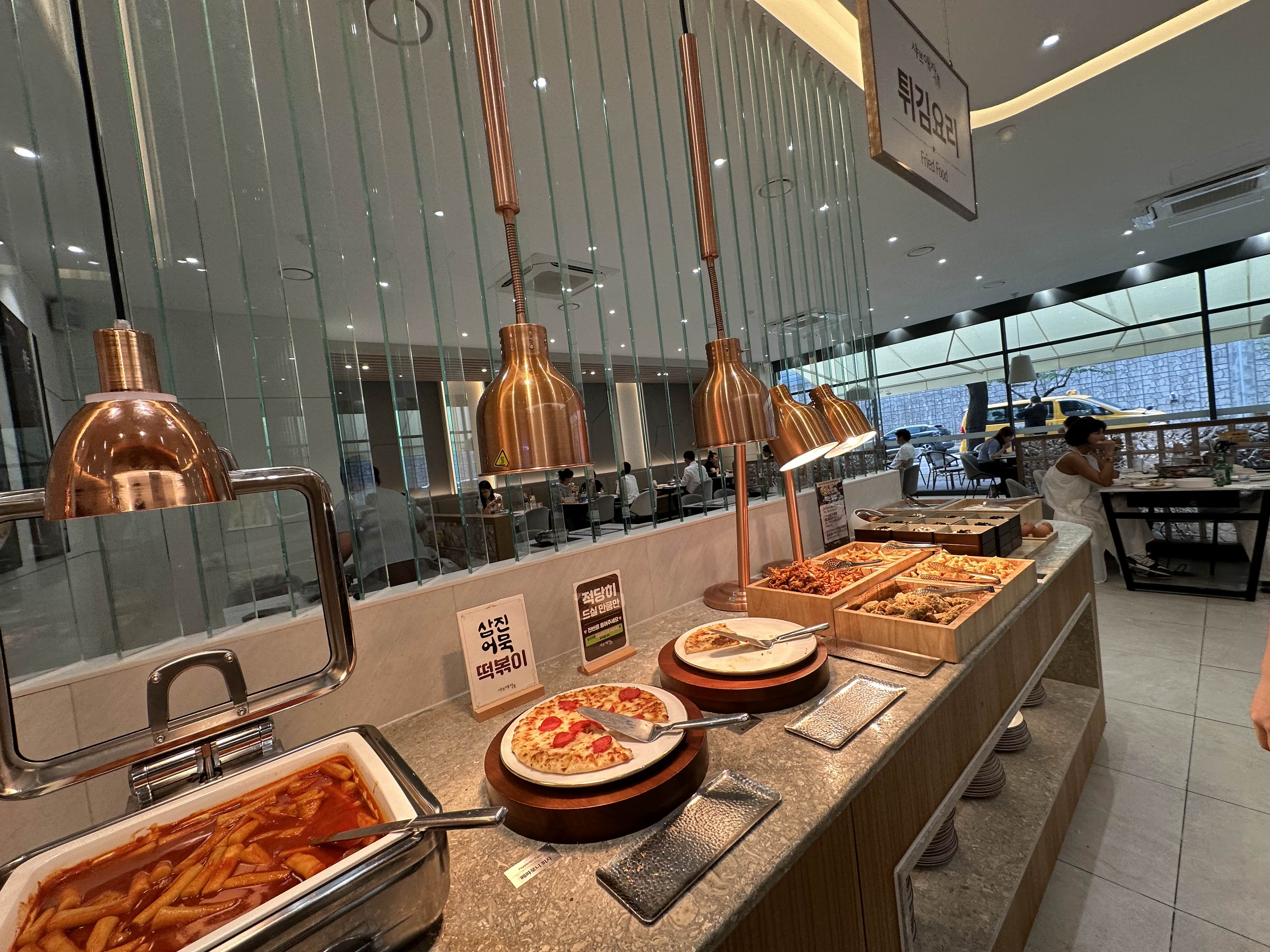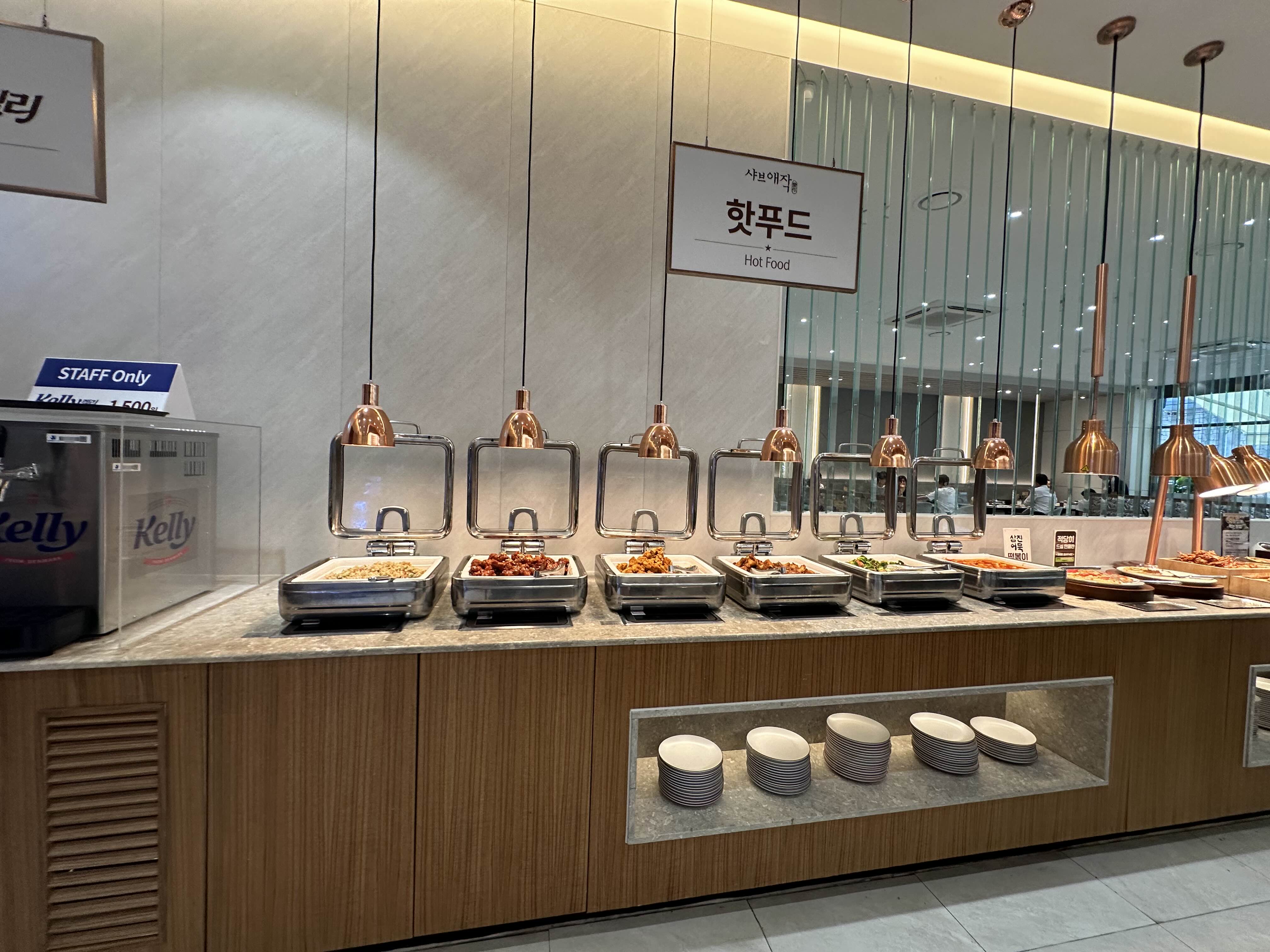 그 외에도 삼진어묵, 떡볶이, 피자, 튀김 같은 다양한 음식들이 있었고, 음료와 과일도 수박, 오렌지, 방울토마토까지 있었다. 핫푸드로는 치킨강정, 볶음밥, 육전, 새우튀김 등 준비되어 있어서 골라 먹는 재미가 있다.