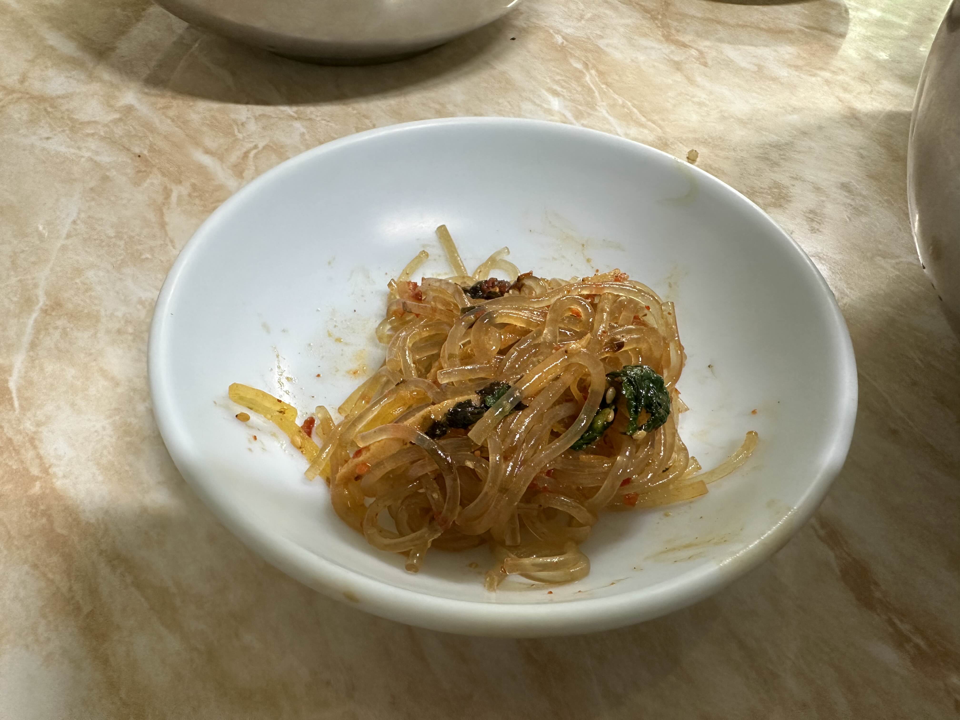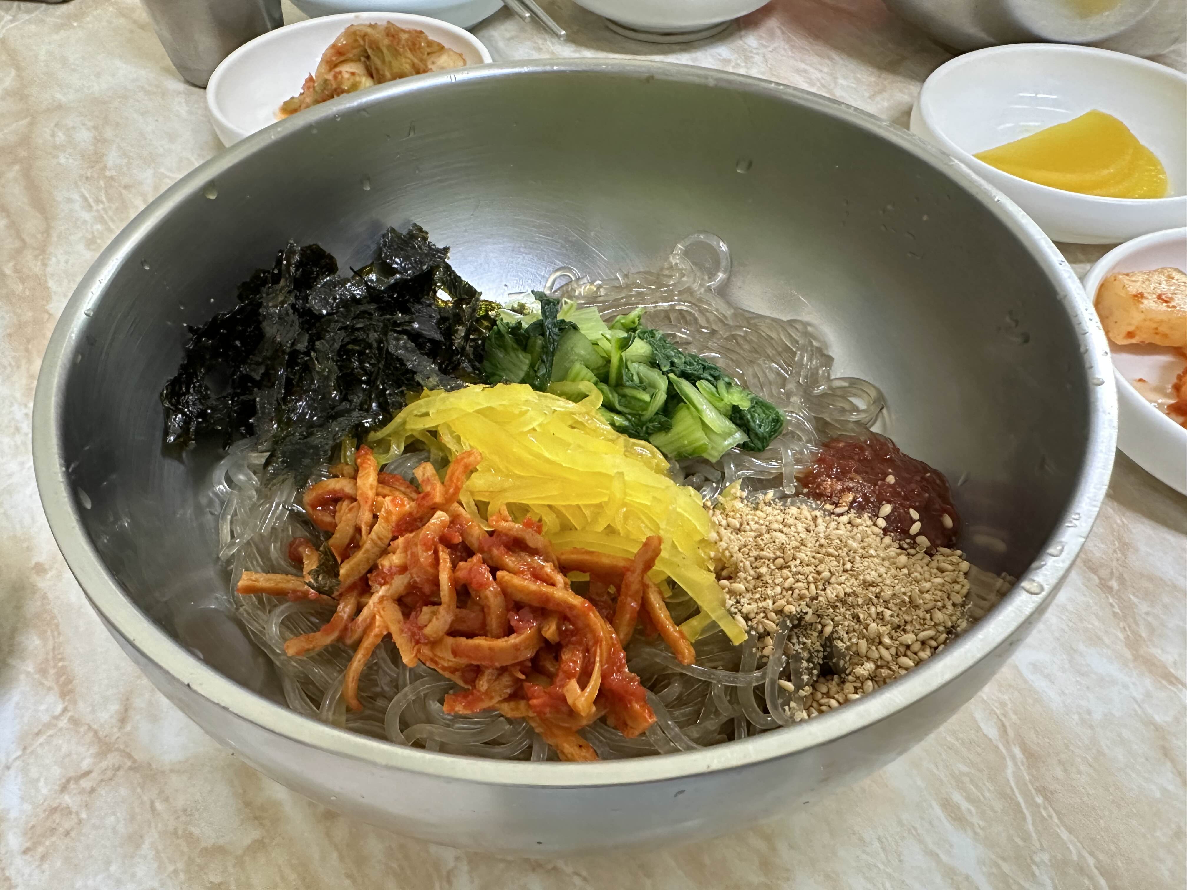 우리는 사이드 메뉴로 비빔당면도 주문했다. 따뜻하게 금방 나온 비빔당면은 별미였다.