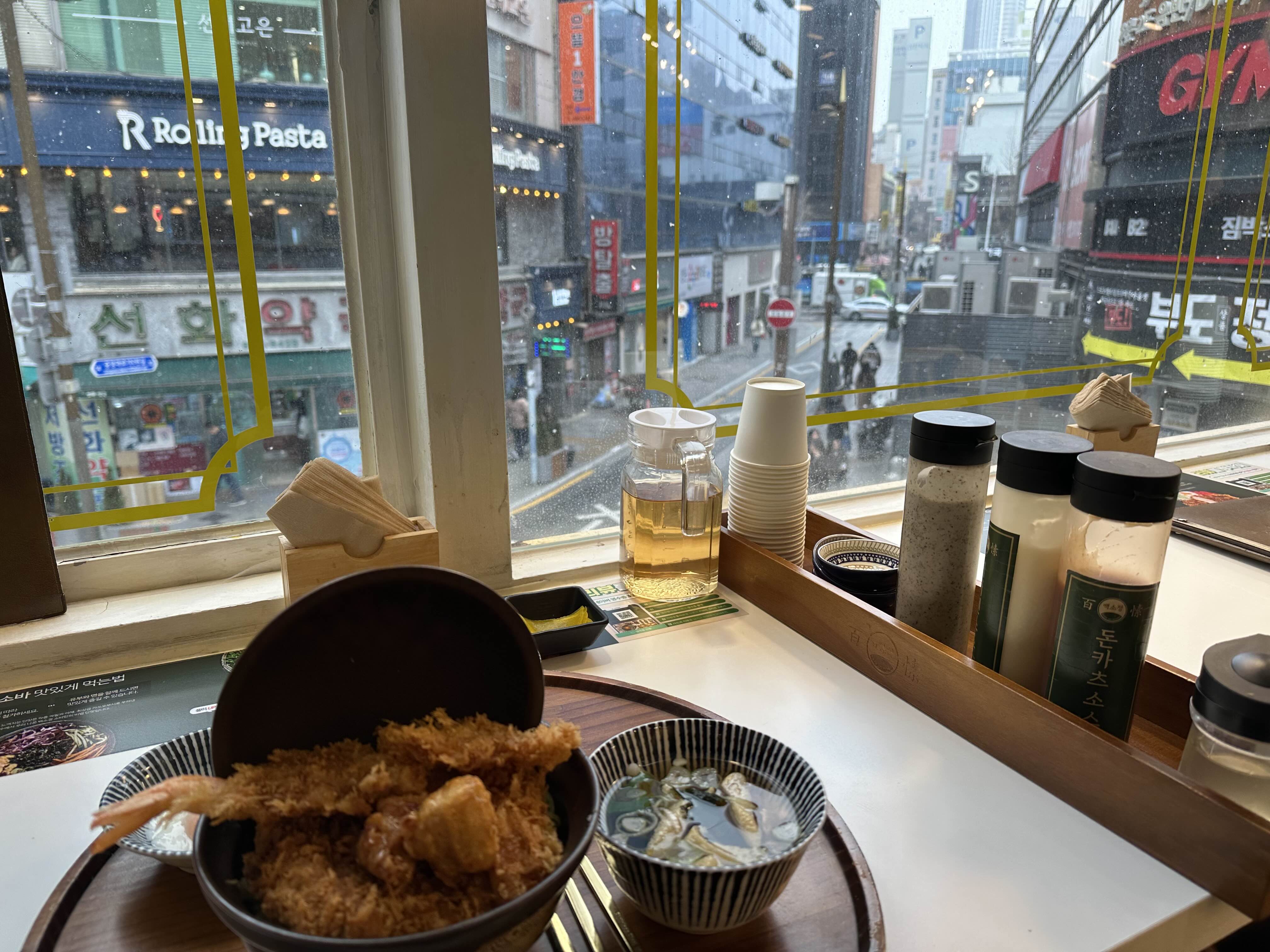 돈카츠, 새우튀김1개, 가라아게, 온센타마고(온천달걀), 소우동, 샐러드, 연유치즈떡