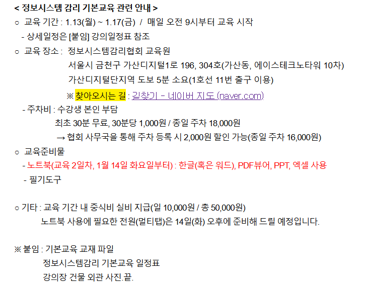 📌 25년 1월 7일 (화) – 교육 일주일 전, 감리협회에서 교재 파일 송부 및 제사항 안내 메일 수신