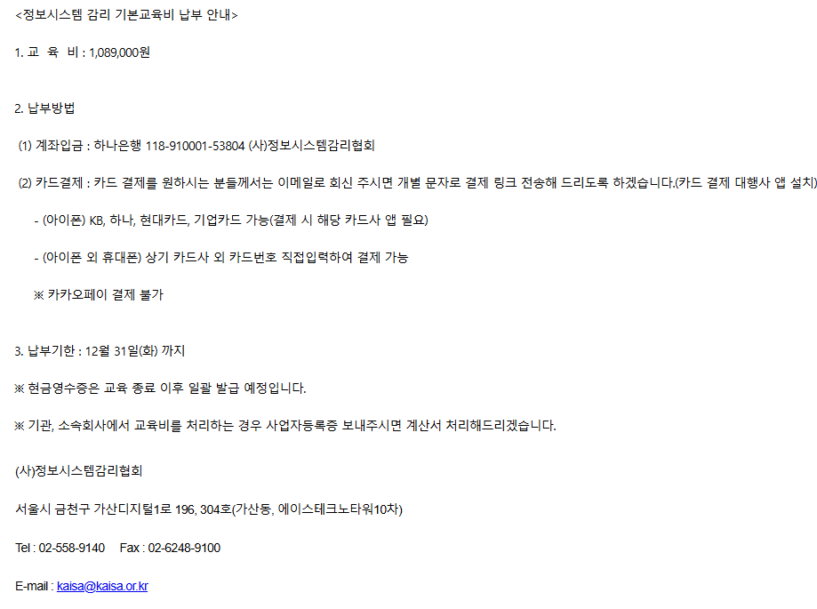 📌 12월 23일 (월) – 감리협회에서 교육비 납부 안내 메일 수신