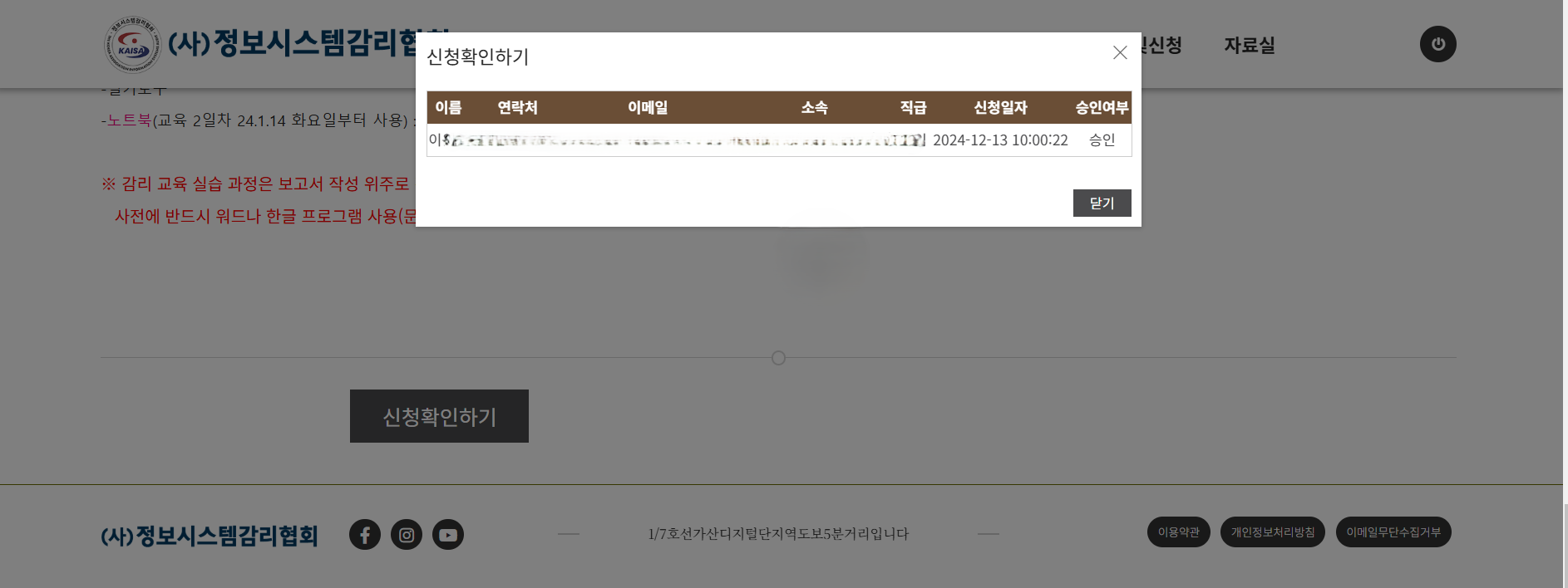 신청이 승인된 것을 확인한 후, 감리협회 이메일로 교육 관련 구비 서류를 제출했다.