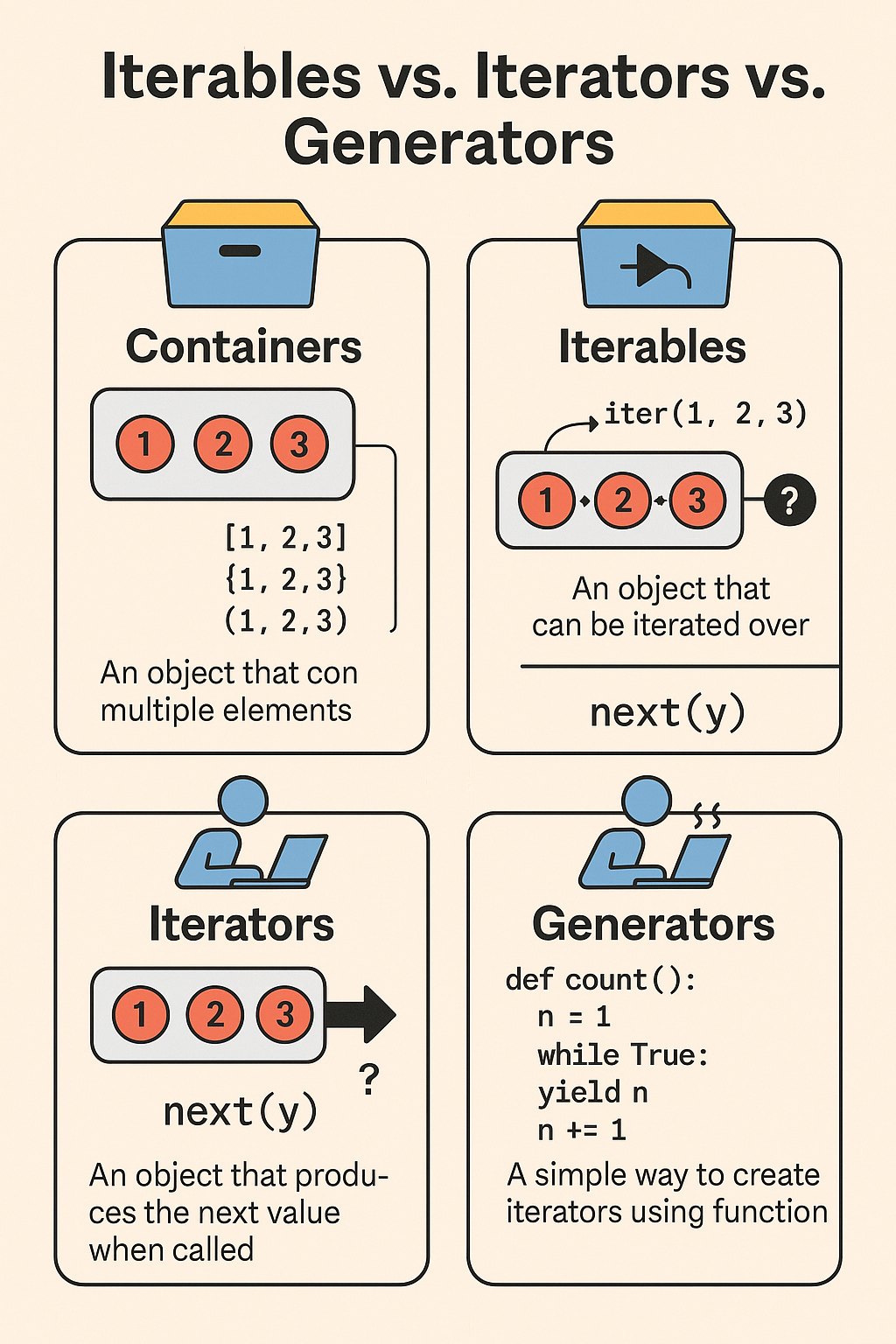 | Iterator | next()로 다음 값을 줄 수 있는 상태 저장 객체 | iter(list) 결과, zip(), map() | __iter__()와 __next__() 둘 다 구현 |