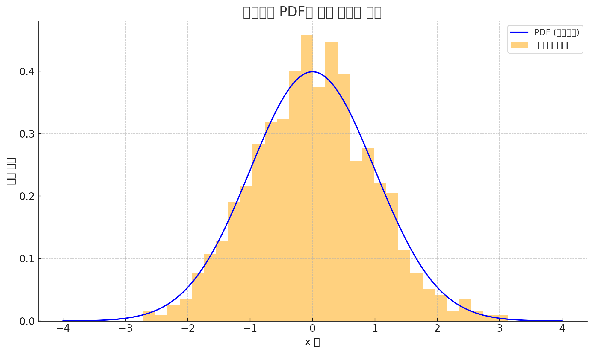 - 파란 선 (PDF): 평균 0, 표준편차 1인 정규분포의 이론적 곡선입니다.