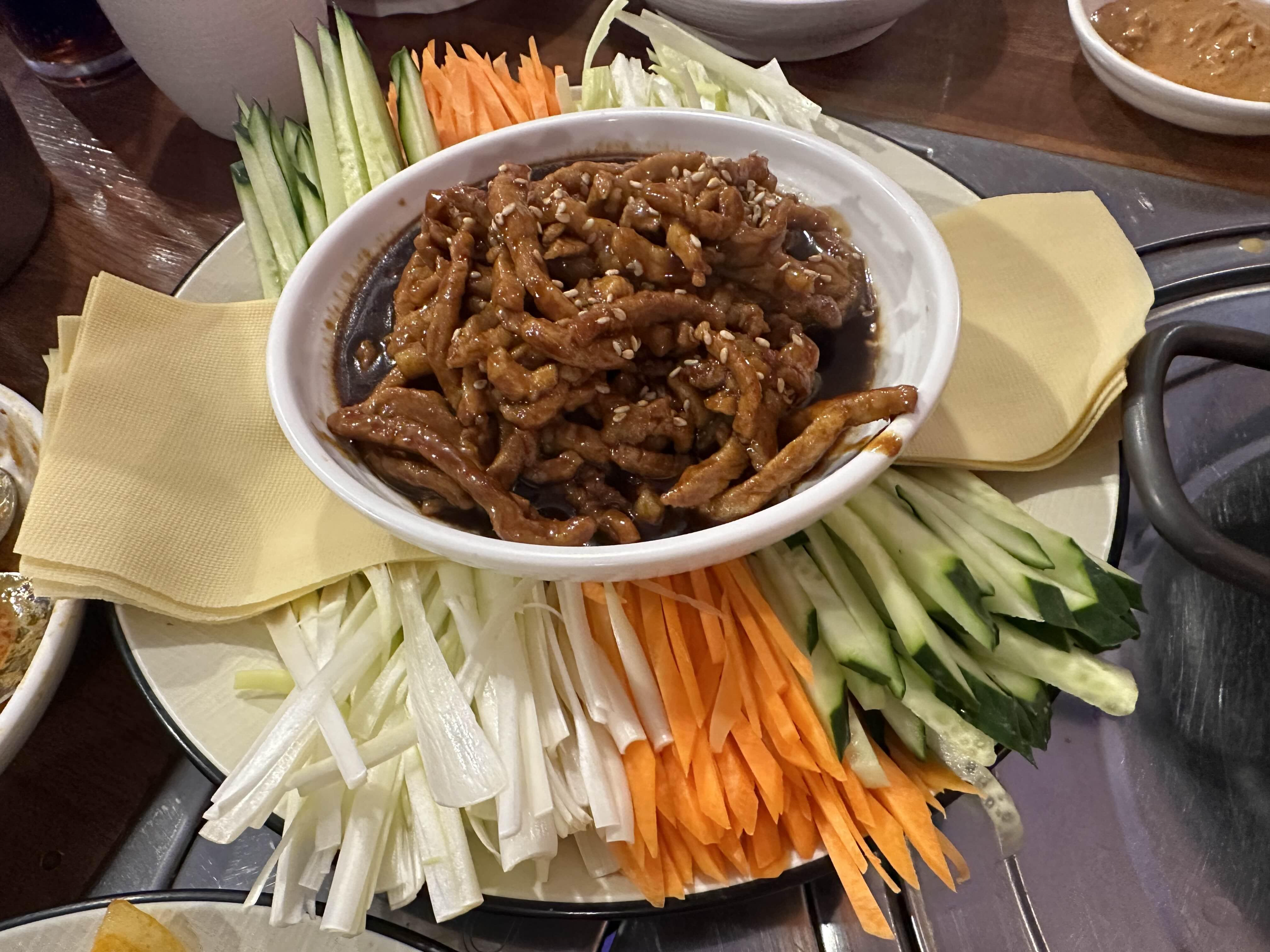 정지양러오스는 중국식 소고기 볶음 요리로, 얇게 썬 소고기와 채소를 함께 제공된다. 소고기의 부드러운 식감과 짭짤한 소스가 어우러져 두부포와 싸먹기 좋았다. 고소하면서도 감칠맛 나는 소고기의 풍미가 일품이었다.