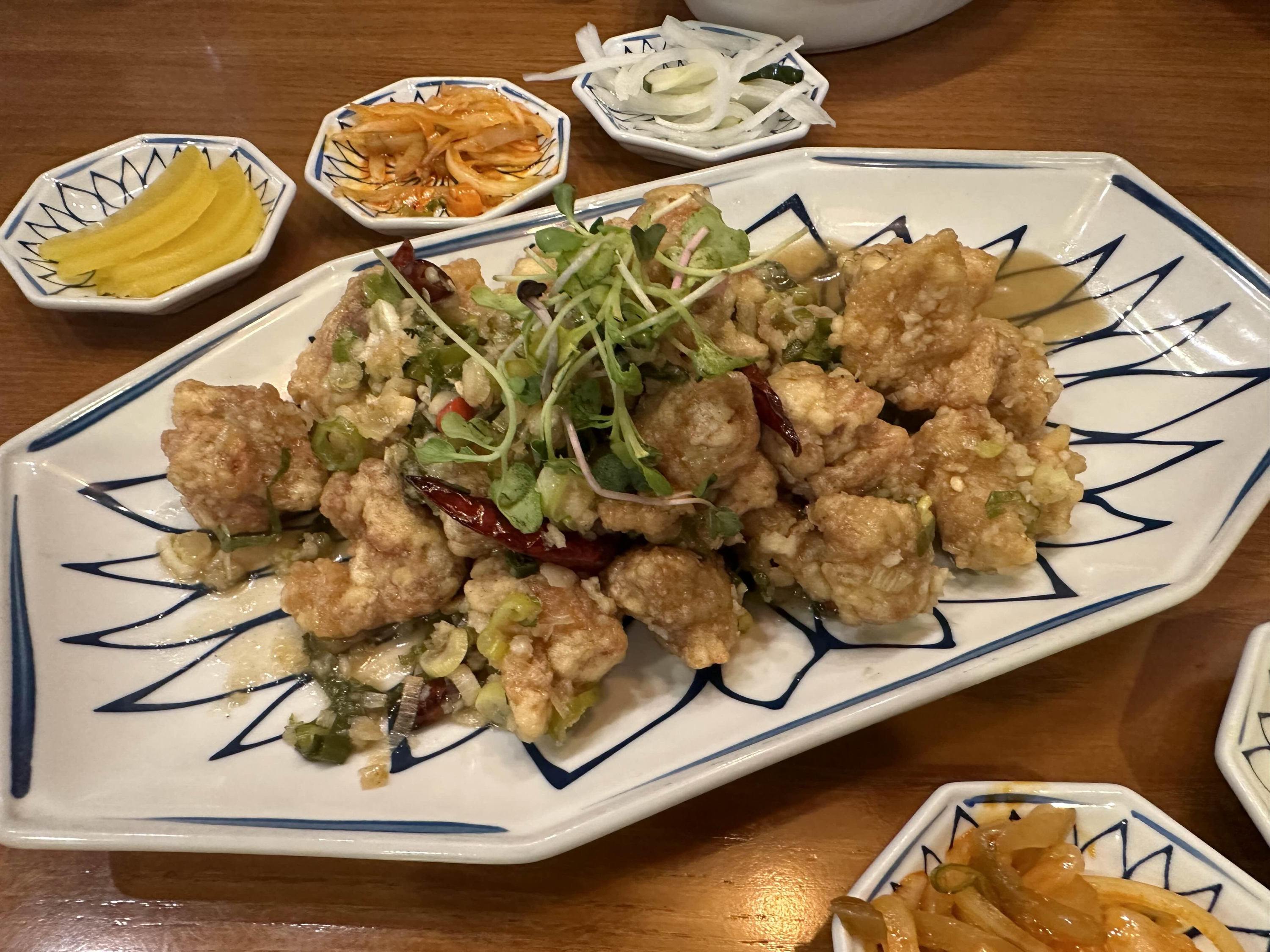 닭다리살을 한입크기로 튀겨서 매콤새콤한 소스로 볶아내는 요리
