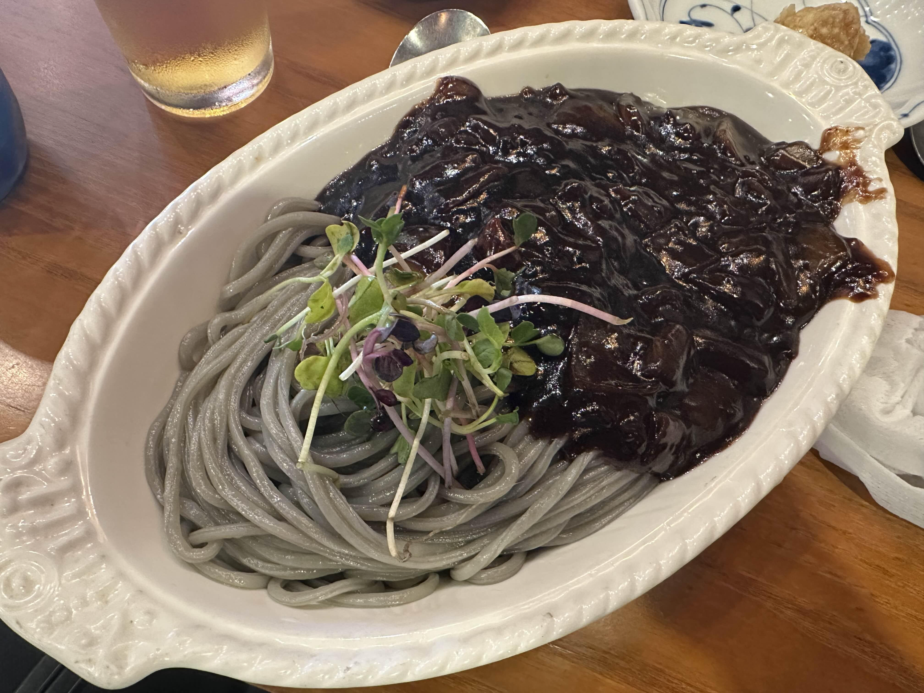 오징어 먹물로 반죽한 면은 일반적인 면과는 다르게 독특한 회색을 띠고 있었고, 그 모습이 시각적으로도 참 인상적이었다. 먹어보니 면의 식감이 쫄깃하면서도 부드러워서, 짜장 소스와 잘 어우러졌다. 새로운 맛을 시도해본다는 즐거움을 느낄 수 있었다.