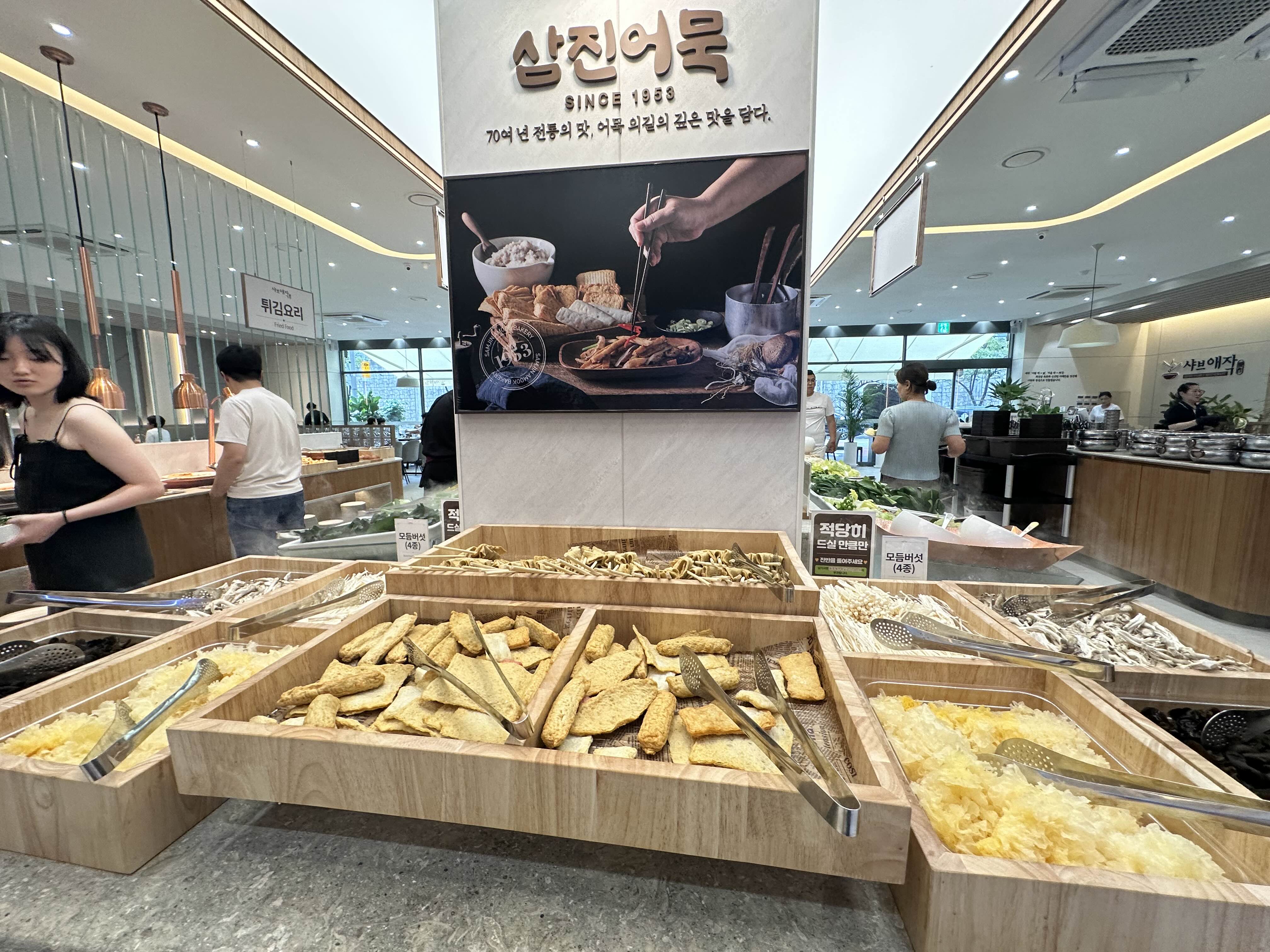 그 외에도 삼진어묵, 떡볶이, 피자, 튀김 같은 다양한 음식들이 있었고, 음료와 과일도 수박, 오렌지, 방울토마토까지 있었다. 핫푸드로는 치킨강정, 볶음밥, 육전, 새우튀김 등 준비되어 있어서 골라 먹는 재미가 있다.