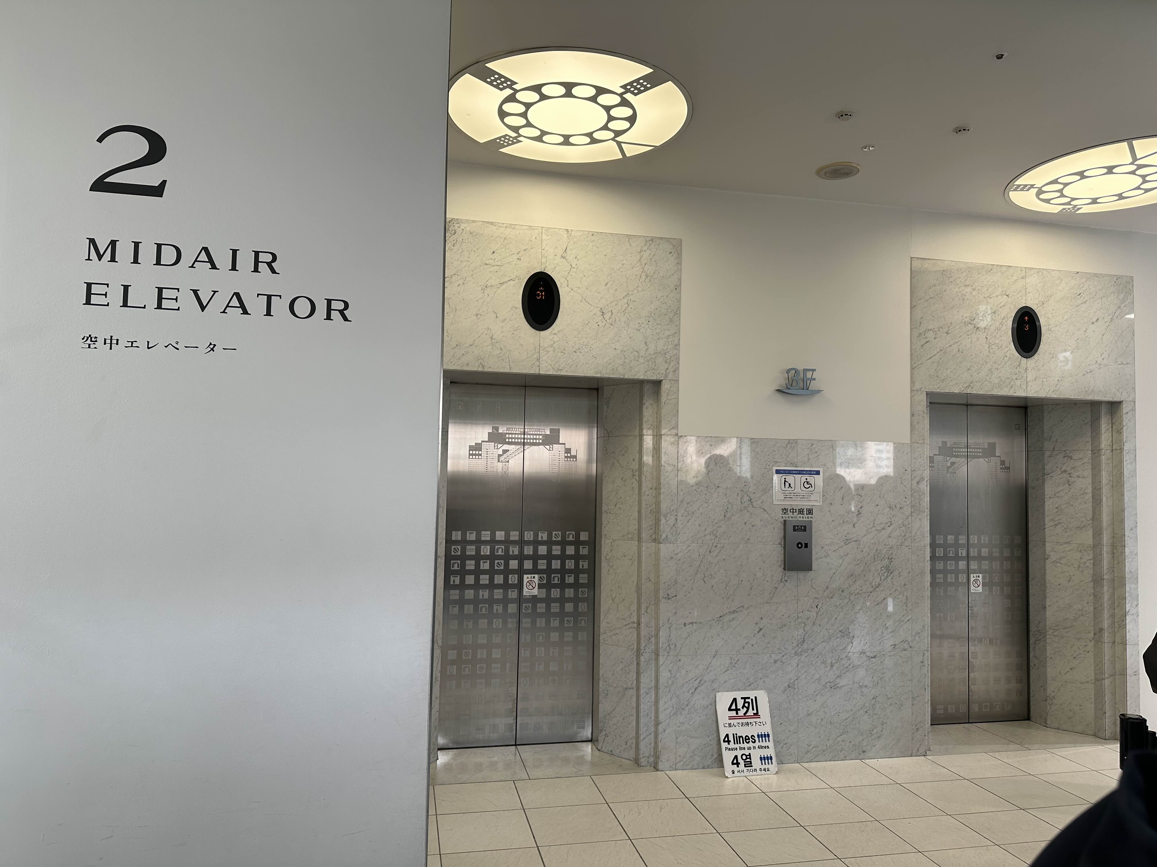 우리는 오후 2시 50분, 간신히 입장 마감 시간 전에 도착해 QR코드를 보여주고 입장할 수 있었다. 2층에서 4열로 나뉜 줄에 서서 대기했고, 엘리베이터를 타고 37층까지 올라간다. 서울 잠실 롯데월드타워 초고층 엘리베이터와 비교하면 엄청 느린속도지만 그래도 높이 올라간다.