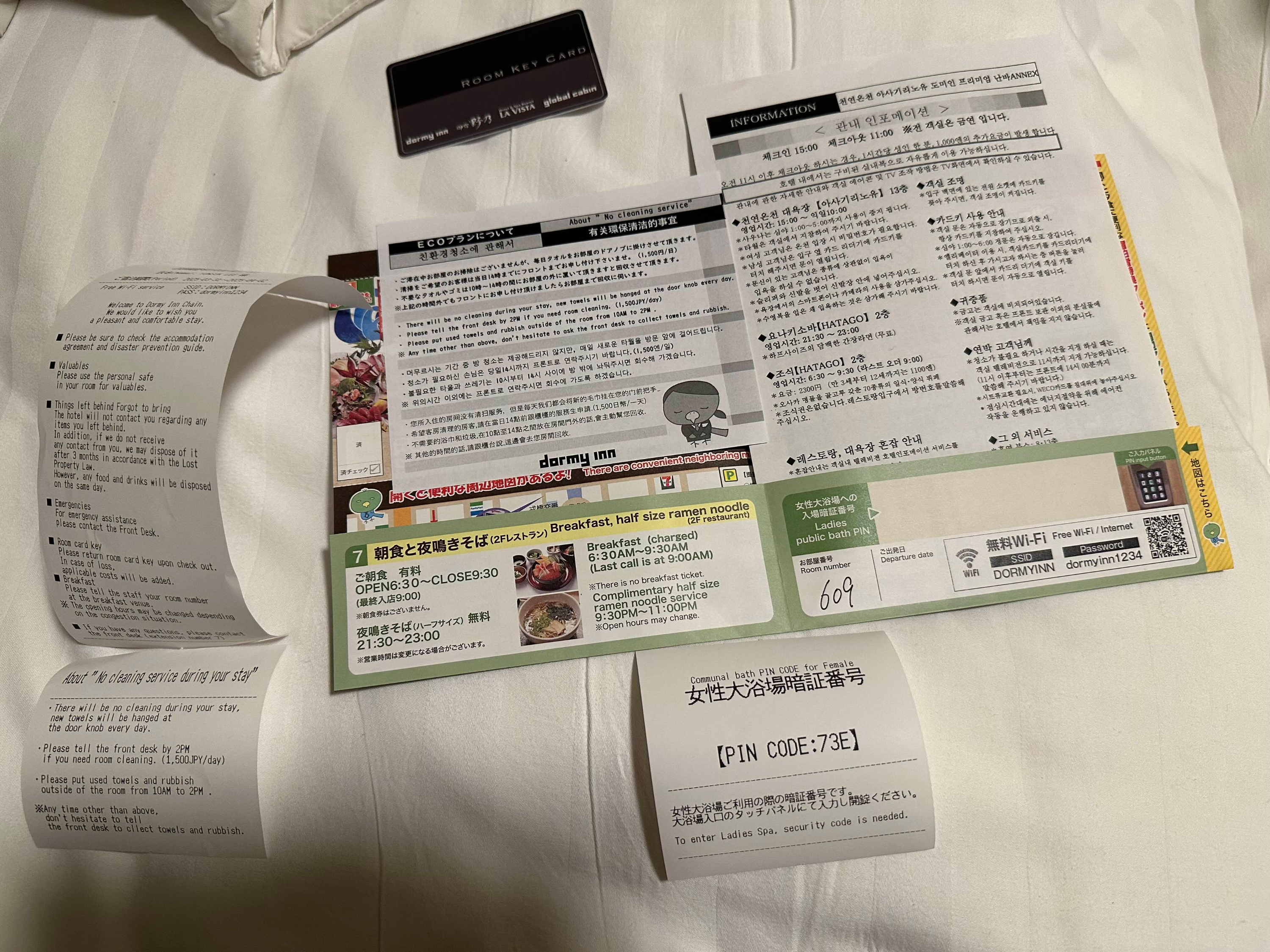 낮 동안 계속 걸었고, 양손에는 마트에서 사온 음식이 한가득이라 호텔에 도착하자마자 안도감이 밀려왔다. 이곳에서 이틀을 묵을 예정인데, 숙소는 잠자고 온천하고 조식 먹는 공간이라 생각하면 충분히 만족스러웠다.