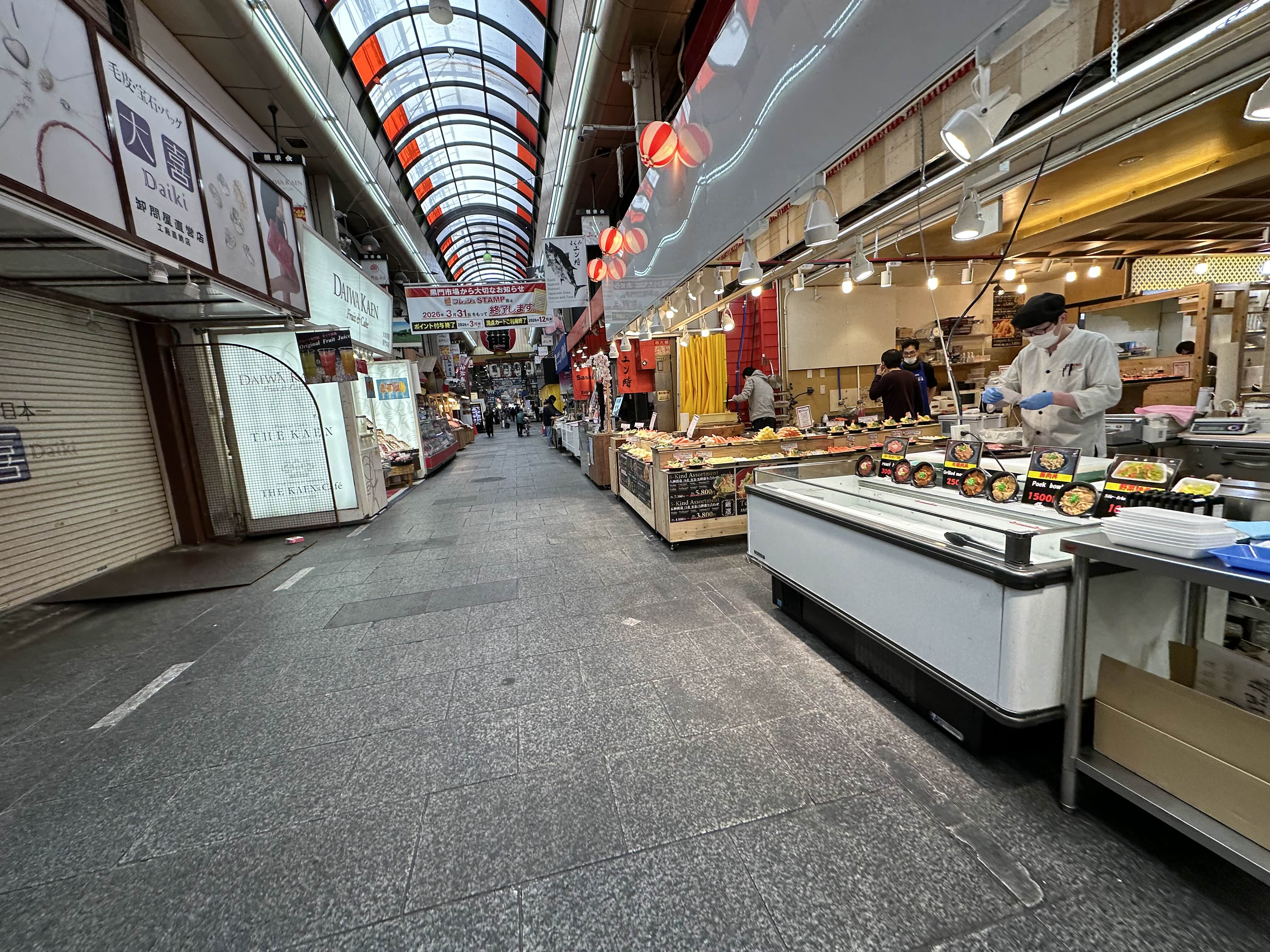 오사카에서의 마지막 하루가 시작되었다. 오전 8시 30분경, 쿠로몬 시장을 지나며 여행의 하루를 열었다. 아침부터 분주한 상인들의 손길이 분명하게 느껴졌다. 역시 시장은 아침 일찍 가야 제맛이다. 먹음직스러운 음식과 활기찬 분위기 덕분에 그냥 지나치기만 해도 기분이 좋아진다.